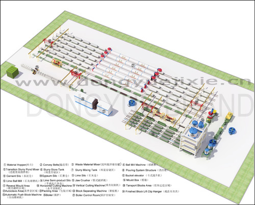 1.裝載機(jī)將沙子原材料放入沙子料斗中,沙子通過傳送帶進(jìn)入球磨機(jī),并加水研磨,細(xì)度在180-200目,研磨后沙漿通過料漿泵送入料漿存貯攪拌罐儲存?zhèn)溆谩?BR>2.水泥.石灰.石膏.以及沙漿通過螺旋輸送機(jī)和管道進(jìn)入計量稱稱量,水泥、石灰、石膏、沙漿稱量后匯入澆注攪拌機(jī),鋁粉通過鋁粉攪拌機(jī)攪拌后注入澆注攪拌機(jī),經(jīng)過約5分鐘的攪拌后,料漿被注入模具內(nèi)。其中料漿的注入有PLC控制, (三)東岳工程師設(shè)計的加氣混凝土廠效果圖